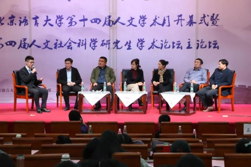 2018年11月16日下午三点,北京语言大学第十四届人文学术月开幕式暨第四届人文社会科学研究生学术论坛主论坛在逸夫报告厅顺利举行。本届人文学术月继续围绕“学思问道”这一主题进行。北京语言大学副校长黄益方教授、人文社会科学学部主任程娟老师、外国语学部党委副书记张磊老师、商学院副院长宋晓玲老师,人文社会科学学部副主任、汉语教育学院院长施家炜老师,人文社会科学学部副主任、新闻传播学院院长云国强老师,汉语教育学院杨玉玲老师,人文学院黄悦、席加兵老师,新闻传播学院郭之恩老师,学部学生工作办公室马铖老师、李双依老师和学部教务办公室玄铮老师,以及人文社会科学学部、中华文化研究院的二百余名同学们出席了开幕式活动。