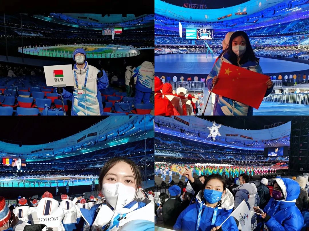 ①2022年2月4日,举世瞩目的北京2022年冬奥会开幕式在国家体育场隆重举行。文学院学生志愿者李佳乐、陈巨荣、杜睿瑶、陈宇浩与教师志愿者玄铮作为北京冬奥会参赛代表团助理,承担了4个代表团的正式开幕式集结工作,助力完成运动员入场式,完成了从河北张家口冬奥村到北京国家体育场这条最长流线、最长流程、最多环节、最多部门联动的“公铁联运”。国家体育馆学生志愿者范炅玟和教师志愿者万阳卓在开幕式现场观礼。