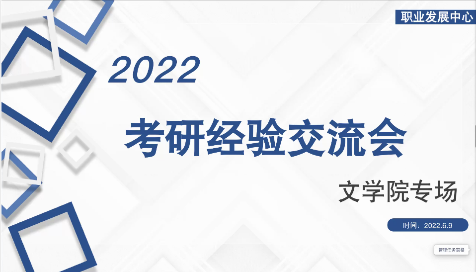① 6月9日晚19:00,2022年文学院考研经验交流会于线上顺利举办,文学院2018级本科生许源桐、季嘉欣、董淏谊、李健谊、韩昕月受邀为同学们分享考研经验。