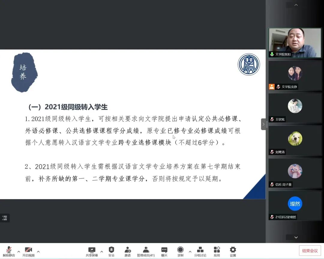 ② 6月3日上午,文学院召开2021-2022学年转专业工作说明会,党委书记张阳老师向计划申请转入汉语言文学专业的学生系统介绍转专业工作方案并做答疑。