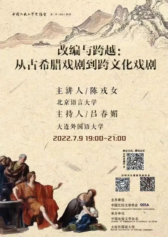 ⑤ 中国比较文学云讲堂·第三季(2022)第四讲将于2022年7月9日晚7点至9点在线上双平台举办。此次讲座的主题为“改编与跨越:从古希腊戏剧到跨文化戏剧”,主讲人为我校陈戎女教授。讲座由大连外国语大学吕春媚教授主持。