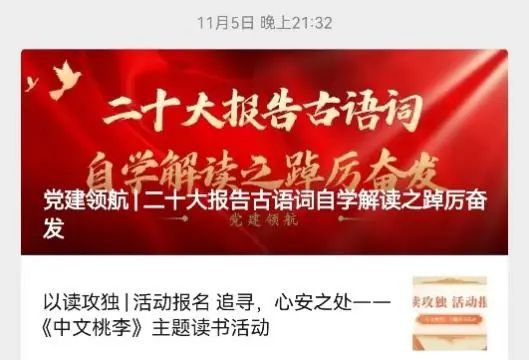 学院党委组织文字文献研究生党支部、古代文学专门史研究生党支部和相关教工支部对这些古语词进行了自学和解读,自11月5日起在微信公众号平台上推出“二十大报告古语词自学解读”系列栏目,从古语词入手,深入学习党的二十大报告。