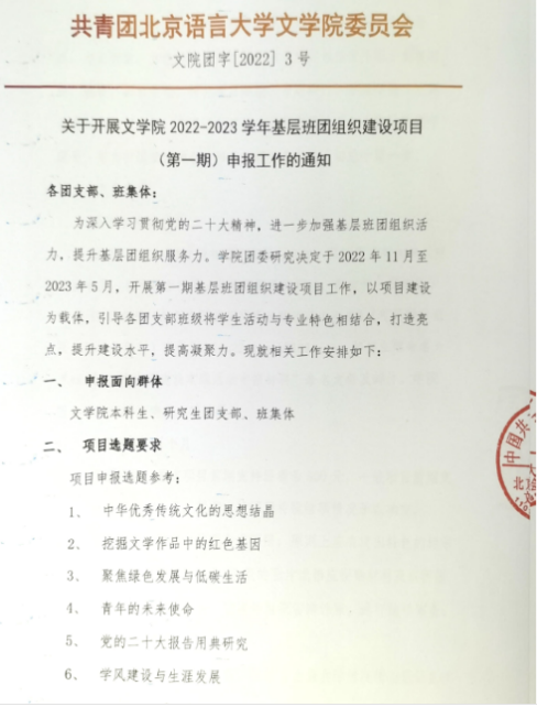 11月4日 为深入学习贯彻党的二十大精神,以高质量党建引领高质量事业发展,学院党委发布“学思践悟,踔厉奋发”党建立项申报工作的通知,并指导团委同步开展基层班团组织建设项目立项工作。