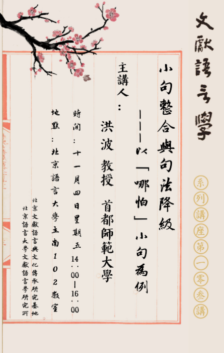 文献语言学系列讲座第103期:小句整合与语法降级——以“哪怕”小句为例,于11月4日 于主南楼102教室举行,由首都师范大学文学院教授洪波主讲。