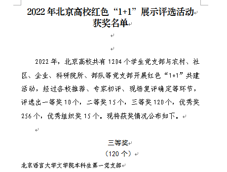 ②近日,2022年北京高校红色“1+1”示范活动结果公布,共有1204个学生党支部与农村、社区、企业、科研院所、部队等党支部开展红色“1+1”共建活动,经过各校推荐、专家初评、现场复评等环节,文学院本科生第一党支部榜上有名,喜获三等奖。