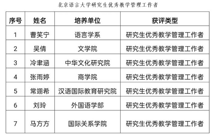 ② 2023年4月10日,教务办公室吴倩老师获评北京语言大学研究生优秀教学管理人员。