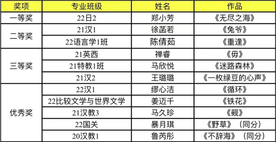 ③2023年4月20日,文学院第一届创意写作大赛公布获奖名单。该赛事自1月19日正式开始后,历时三个月,吸引了来自不同院系、年级同学的积极投稿,最终评选出11份获奖作品。
