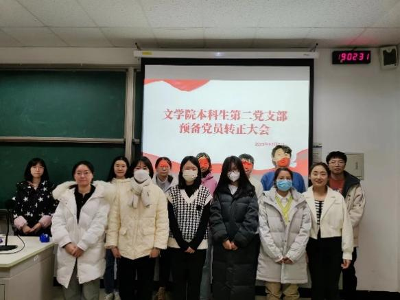 ② 2023年12月5日,文学院本科生第一党支部在教四105召开预备党员转正大会,接收张小轩、洪欣然两位同志为中共正式党员。
