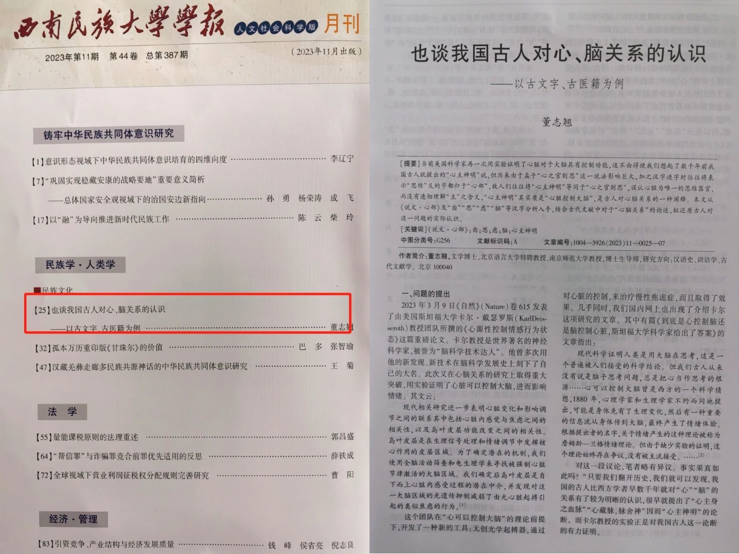 ①董志翘教授论文《也谈我国古人对心、脑关系的认识——以古文字、古医籍为例》发表于《西南民族大学学报》2023年第11期。