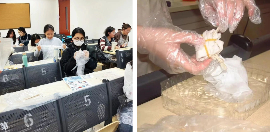 ① 2024年3月15日下午,22汉1团支部在教四104教室开展了“夏布生花”扎染主题非遗特色团日活动。
