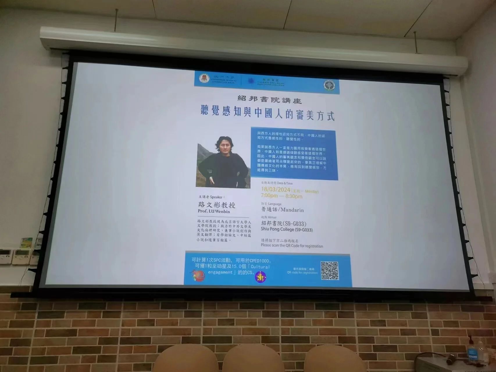 ① 2024年3月18日,路文彬教授应澳门大学绍邦书院之邀,为该校本科生和硕博研究生做了题为《听觉感知与中国人的审美方式》的讲座。