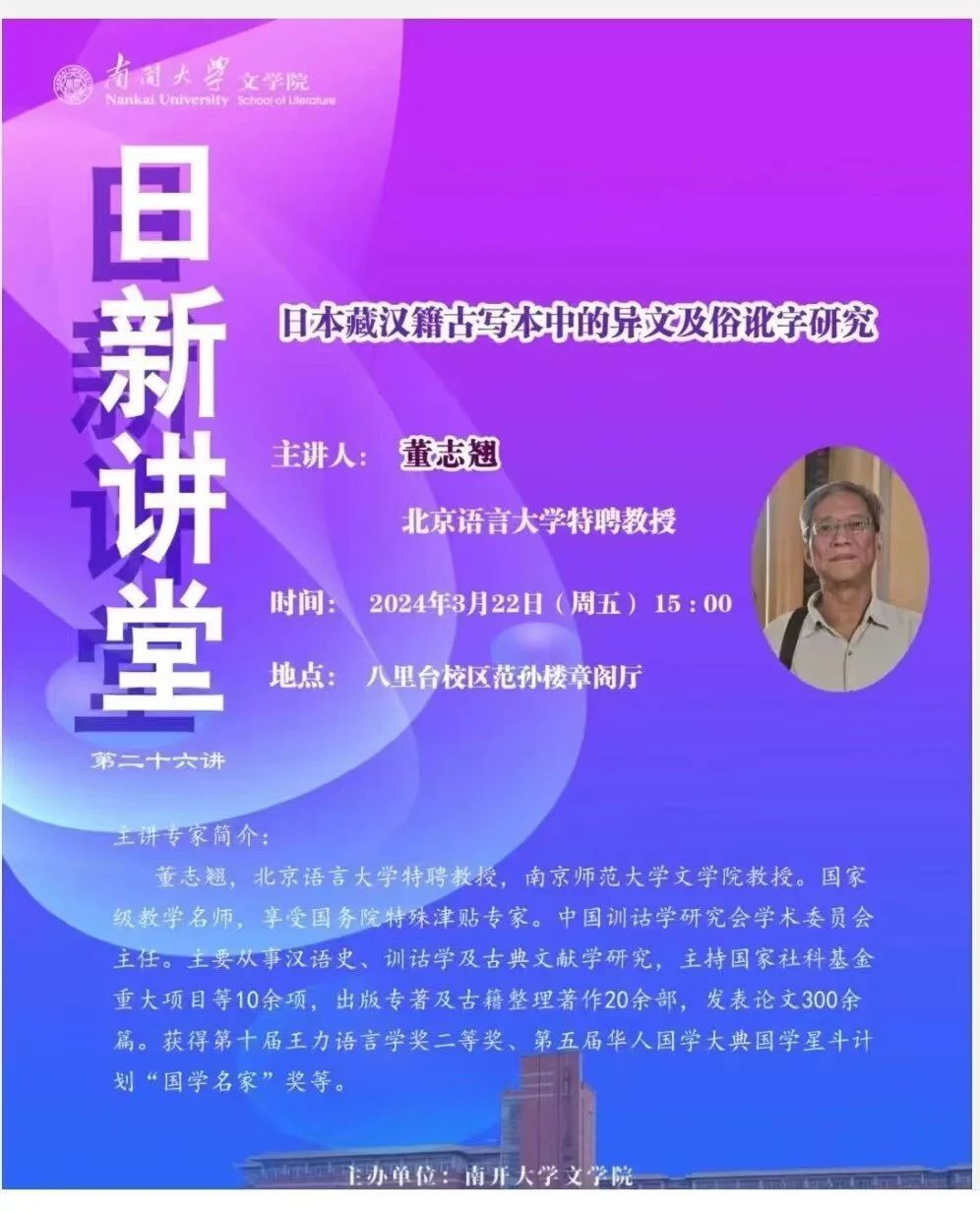 ⑥ 2024年3月22日下午,董志翘教授应邀在南开大学文学院“日新讲堂”作“日本藏汉籍古写本中的异文及俗讹字研究”的学术讲座。