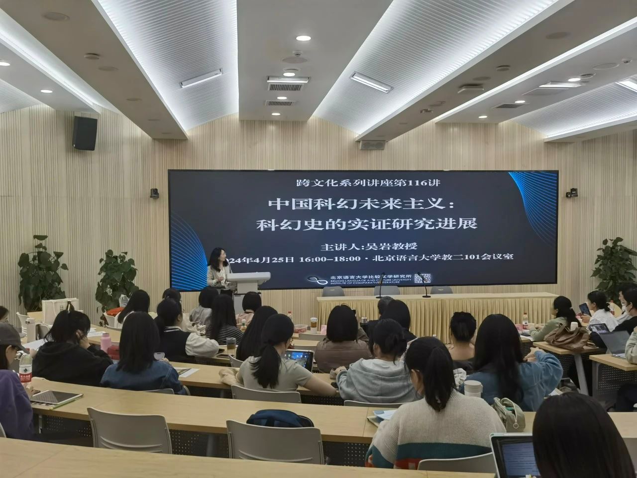 ① 2024年4月25日下午,由北京语言大学比较文学研究所主办的跨文化系列讲座第116讲在教二101会议室顺利举行。吴岩教授带来“中国科幻未来主义:科幻史的实证研究进展”的主题讲座。