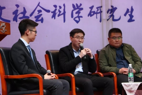 在随后的“学思问道-嘉宾对话”环节中,郭之恩老师、黄悦老师、席加兵老师、杨玉玲老师和优秀学生代表曹国良、韩文易就如何保持对学术的热情、如何在当下社会克服浮躁,坐好“冷板凳”、如何收集整理资料,创建自己的知识体系等问题提出了自己的看法,并和同学们分享自己与学术的故事,学长们也根据自己的生活经历及学习经验,给同学们提出了对未来学习生活规划的建议。最后黄悦老师代表嘉宾给同学们送上寄语,希望同学们在今后的学术生涯中,“披沙沥金,顺藤摸瓜”,找到属于自己的学术果实。开幕式在大家热情的掌声和欢笑声中圆满结束。
