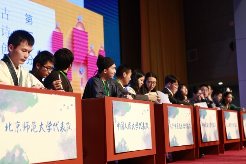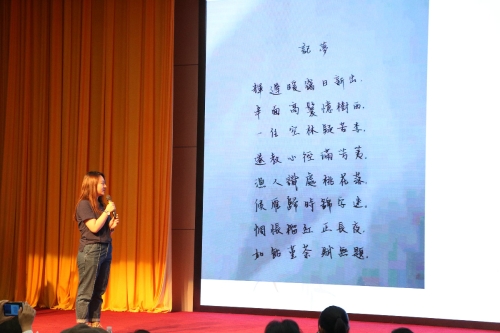 最后一个环节为古诗创作及硬笔誊抄展示,每队派一名队员朗诵本队创作的古体诗,同时在大屏幕上显示。北京语言大学代表队创作的《记梦》运用繁体书写,全诗无一梦字却又展现梦幻意境。评委老师对各队都给予了高度评价,提出各队都展现出了古典诗词美感,诗歌结构完整,韵味十足。