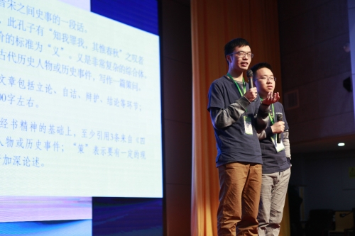 第三个环节为经史策问答辩。现场各代表队的选手思绪横飞,对老师提出的问题应变自如,从各个角度阐述了自己关于“义”的理解,展现人文学子博古通今的风采。北语代表队的选手引用古今中外的各个例子 ,围绕“看不见的义”展开论述并给出了明确的观点:“历史自有判断、公道自在人心”。我校选手凭借着严谨的思维、新颖的观点和独特的视角迎得了评委的连连赞赏,收获了热烈掌声。