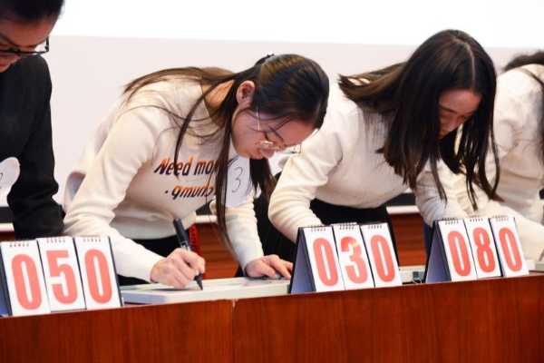 第二轮比赛以擂台赛的方式进行。擂主为了守擂一刻不敢放松,而其他选手更是以十足的认真与热情投入到接下来的攻擂挑战中。紧张刺激的比赛氛围、精彩绝伦的擂台对决,使观众们也全身心地投入到本次活动中,与选手们一起思考赛题,为选手们的优秀表现发出由衷的赞叹。评委老师在对题目进行讲解的同时也会向选手提出相关问题,此外,老师还提到同学们不应该仅会书写汉字,更要主动了解汉字的内涵。