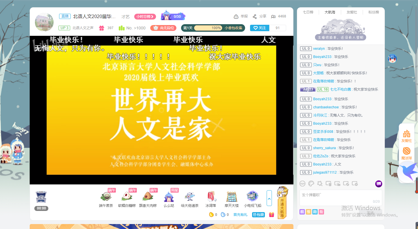 2020年6月25日晚6点30,“世界再大,人文是家”北京语言大学人文社会科学学部2020届线上毕业联欢在北语人文之声哔哩哔哩直播平台正式上映,学部领导、老师、2020届本硕博毕业生和家长们一同在线上观看。