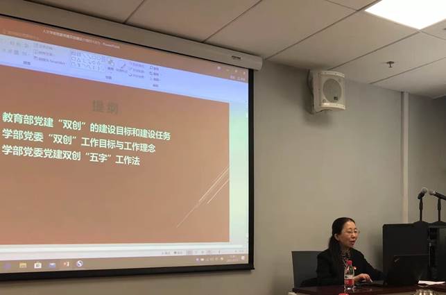 在学习交流环节中,程娟以“北京语言大学人文社会科学学部党委第二批新时代高校党建‘双创’工作介绍”为题作了专题报告。她详细介绍了教育部党建“双创”的建设目标和建设任务、学部党委“双创”工作目标与工作理念以及基层党建“五字”工作法等,用理论结合详实的实践案例,深入浅出地解读了学部党建引领事业发展的思路与路径,并与部分与会党员就相关问题进行交流。学部党委副书记卜晨光围绕基层支部的人员构成与文化传承进行了补充说明。