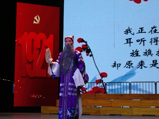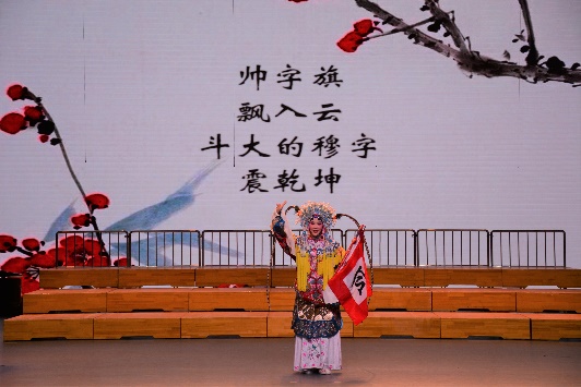 歌声散去,北语中外学生艺术团戏曲队带来的节目《百年薪火梨园情》走上舞台。在锣鼓声中,穆桂英、诸葛亮这些耳熟能详的经典角色相继登场,沙场点兵、空城迎敌,讲述着千百年来刻画在中华民族血脉中的的忠勇智慧。古今交融,传承不息,在《红灯记》与《红梅赞》的动人旋律中,一展共产党人在战斗中的勇往直前、坚强不屈。
