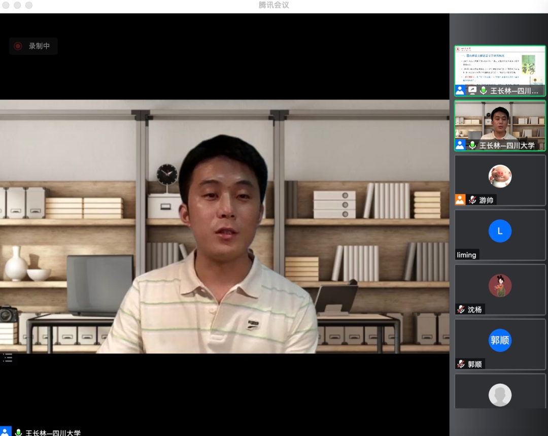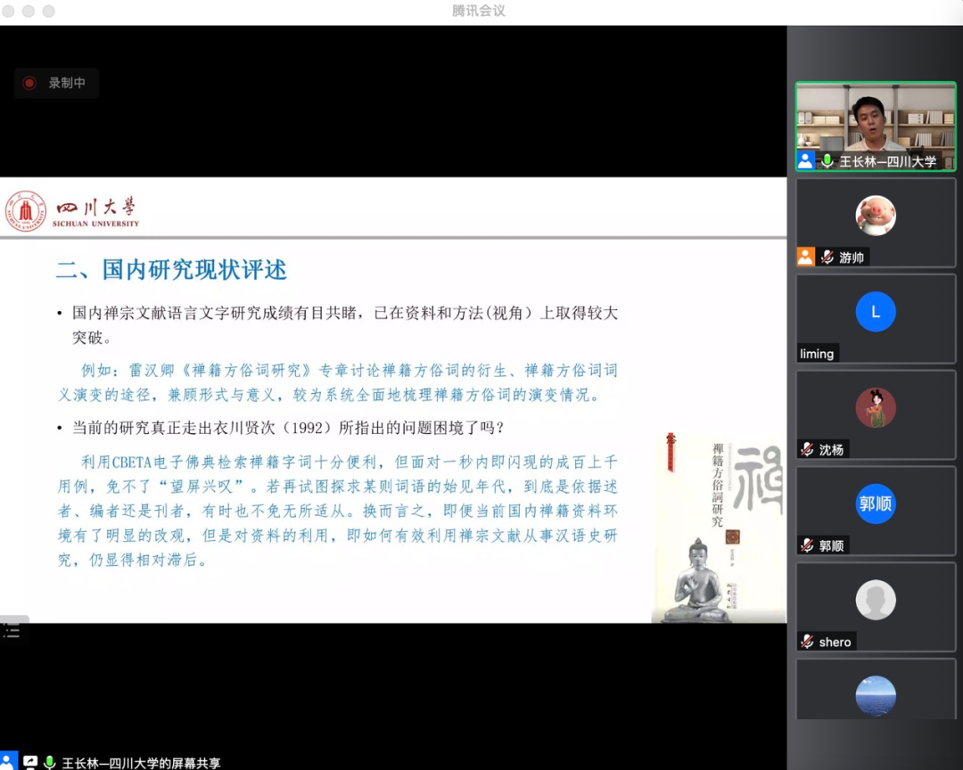 由文学院古代汉语教研室主办的“古代典籍阅读学术沙龙”系列讲座第五讲于7月29日晚间在线上成功举办。此次讲座邀请四川大学王长林老师为我院学子带来了“《禅宗文献语言文字研究的回顾与展望》”的专题报告。此次讲座吸引了校内外200余位师生参加,报告由游帅老师主持。