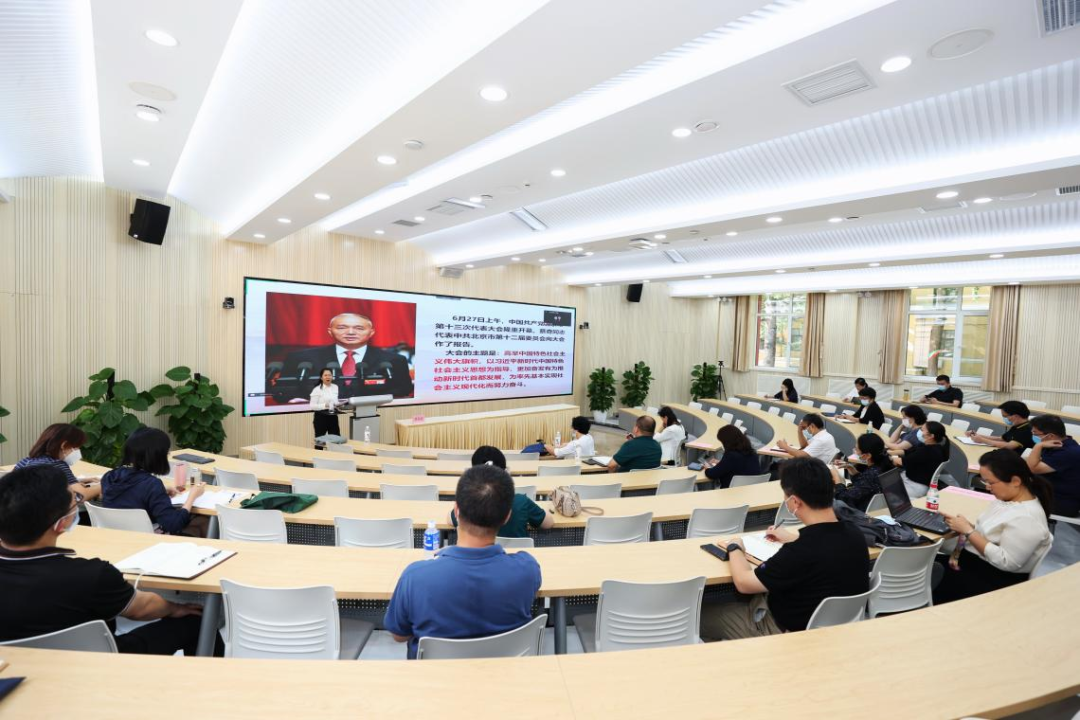 会上,廖扬丽副校长围绕蔡奇书记在北京市第十三次党代会上所作报告,深入介绍了北京市第十三次党代会报告的起草过程,全面总结了首都北京过去五年工作中取得的成就和积累的经验,详细解读了北京市未来一个时期的总体要求和今后五年的重点任务。她指出,北京市第十三次党代会是以“深入贯彻落实习近平总书记对北京一系列重要讲话精神”为主线,以“首都新时代发展”为主题词,深刻说明了新中国成立以来,北京市从“首都建设”到“首都经济”再到“首都发展”的发展过程。在讲授过程中,她将城市管理与生态文明建设、经济发展、保障民生等方面工作紧密结合,并大量列举海淀区具体案例进行深入分析,生动展现了北京市基层党员干部“讲政治”、“能扛活”、“有情怀”、全心全意为人民服务的时代风尚,达到了深入浅出、振奋人心的效果。