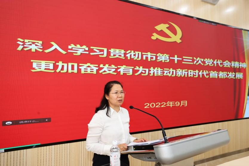 为进一步深入学习贯彻北京市第十三次党代会精神,不断推动党代会精神入心入脑、走深走实,9月9日下午,学校邀请北京市海淀区委党校副校长廖扬丽作《深入学习贯彻市第十三次党代会精神 更加奋发有为推动新时代首都发展》专题辅导报告。报告会在教二楼101会议室以线上线下相结合的方式举行。学校党委常委、组织部部长聂丹,党委常委、统战部部长吕静出席,中层正职干部领航班、远航班部分学员,处级干部理论学习中心组部分成员线下参加,文学院、教师教育学院、新闻学院和国际关系学院的师生党员百余人线上参加。报告会由聂丹部长主持。