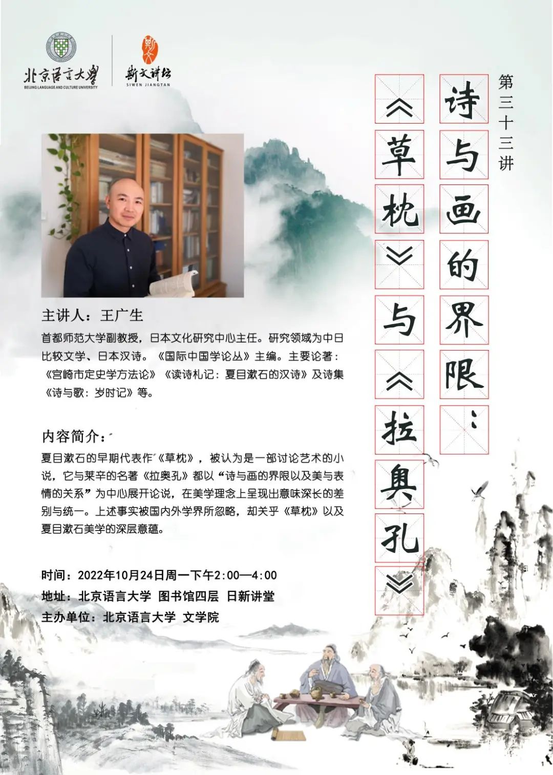 王广生,首都师范大学副教授,日本文化研究中心主任。研究领域为中日比较文学、日本汉诗。《国际中国学论丛》主编。主要论著:《宫崎市定史学方法论》《读诗札记:夏目漱石的汉诗》及诗集《诗与歌:岁时记》等。