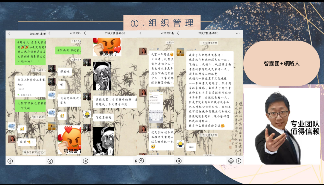 班委们展示了班级的过去取得的成绩与未来规划。除此之外,本次展示采用的形式非常灵活多样,比如19汉1自行制作视频来讲述班级建设成果、20汉2改编歌词进行演唱来传递班级情感等。