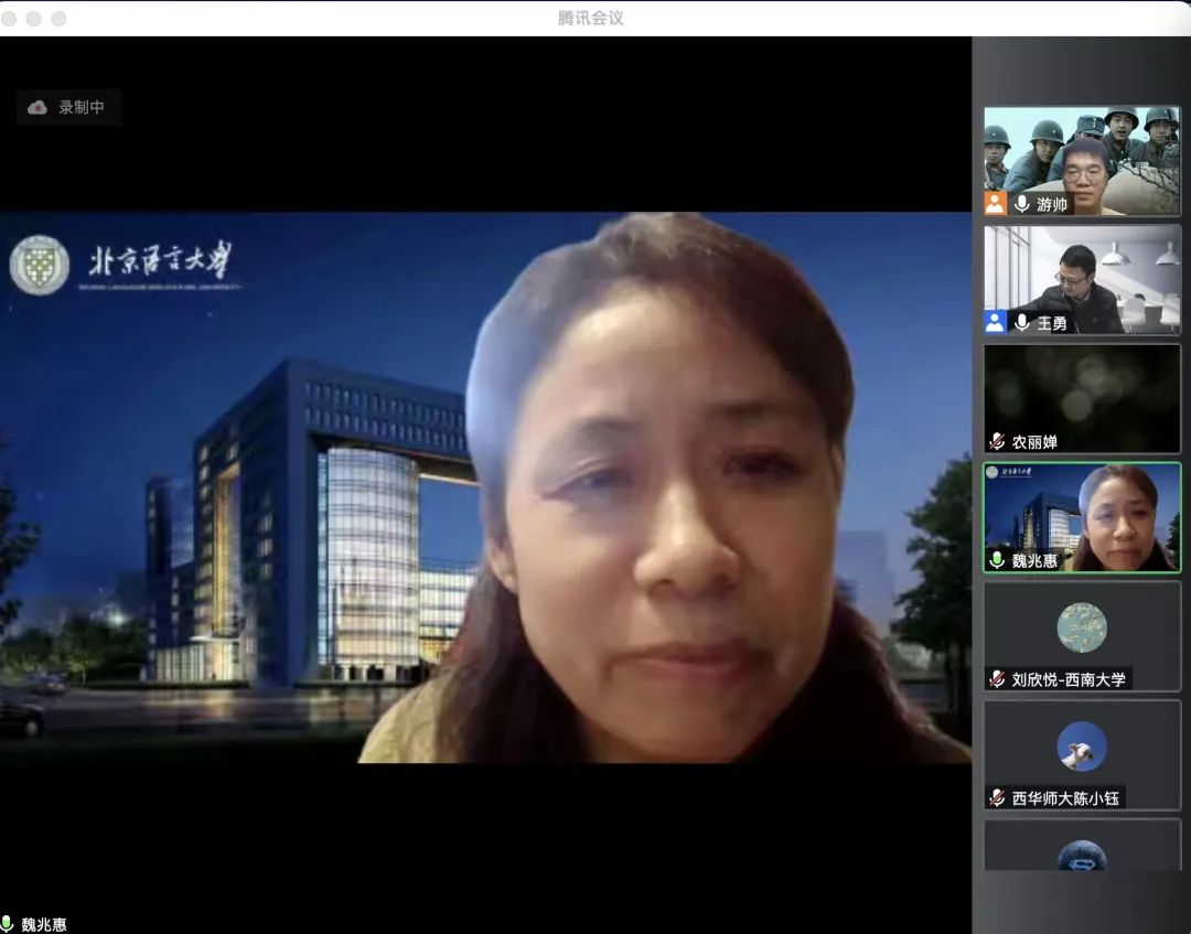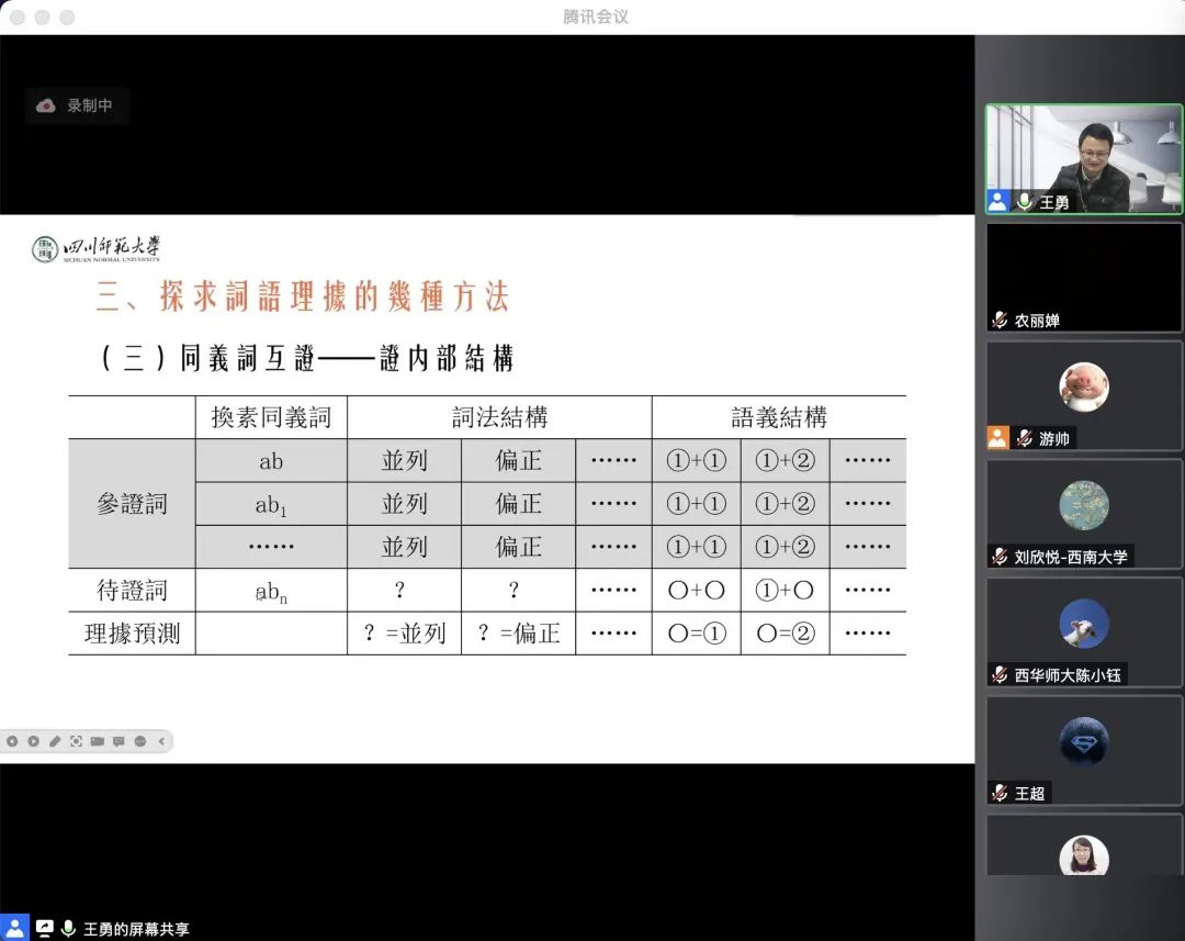 王老师的报告条分缕析,举证丰富,论证严谨,逻辑性强,范式作用鲜明,很好地展示了语言的系统性和语言学研究的逻辑性。报告结束后,王勇老师详细回答了线上听众的热情提问,古汉语教研室魏兆惠、梁慧婧、闫翠科等老师也先后与王勇老师进行了深入的交流互动。讲座在持续了两个小时后圆满结束。