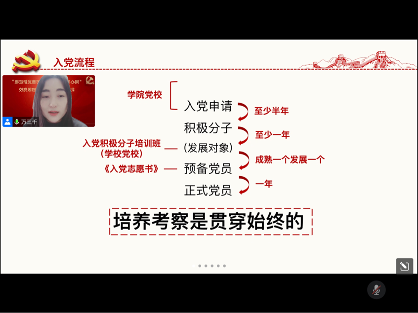 万阳卓在讲座中具体介绍了入党流程,即从提出入党申请、成为积极分子、发展对象、预备党员到正式党员每个培养考察环节的具体要求和注意事项,并提到培养考察贯穿始终,不能有松懈和怠慢。入党申请人要保持主动性、积极性和真实性,思想汇报等材料应自觉写、主动交。