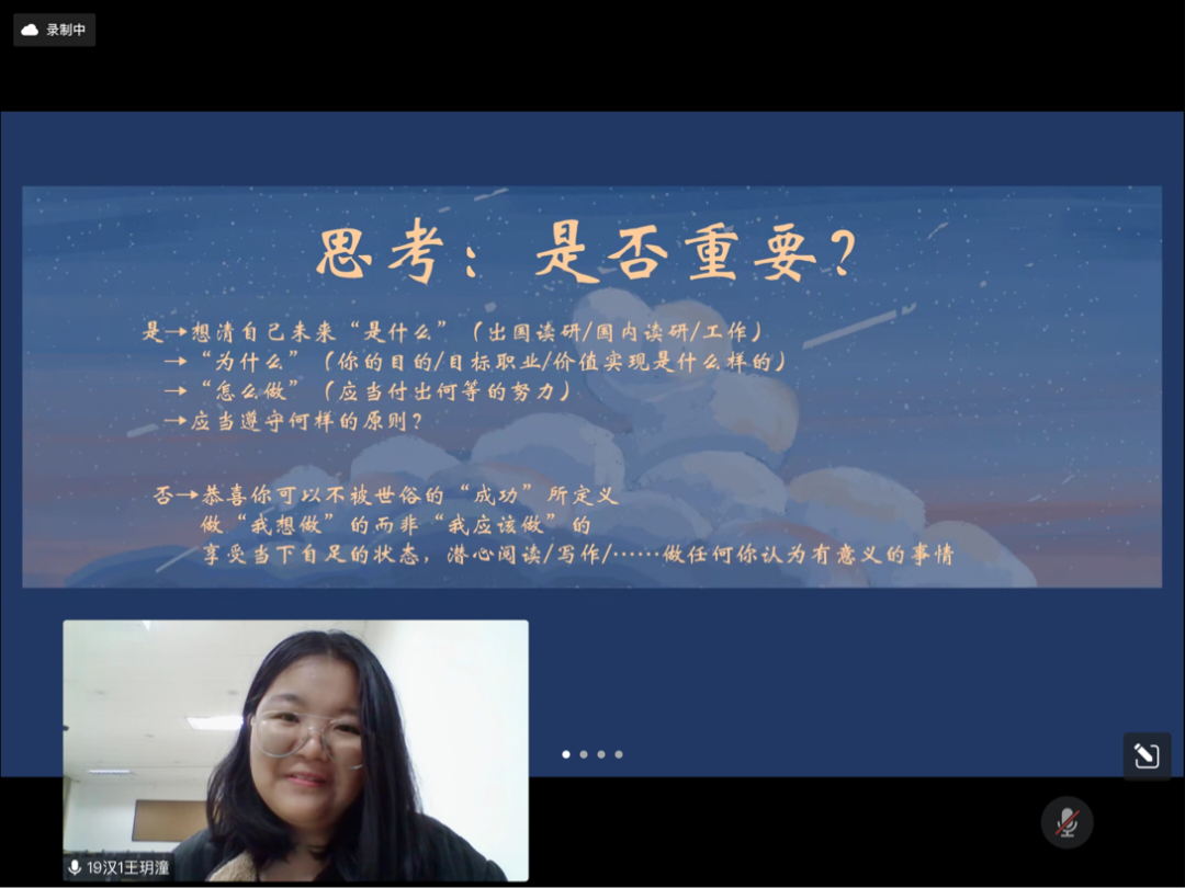 最后是保研至北京大学中国现当代文学专业的王彦力,她从前期准备、复习时间安排、面试的小技巧三个方面进行分享。她侧重于从自身出发结合具体情况制定自己的计划,并向同学们推荐了中国现当代文学方向。除此之外,她告诉同学们要充分利用网络资源,丰富自己的摄入方式,灵活学习,同时参考多版本教材,立足文学作品,提升理论素养。