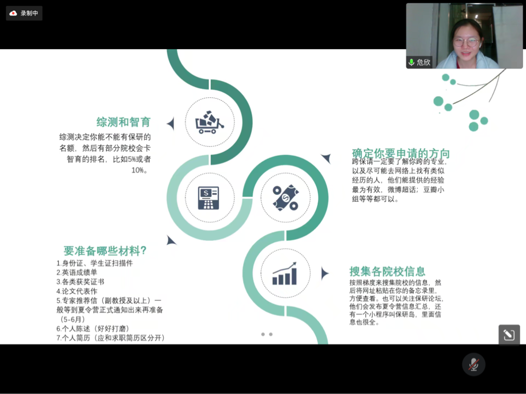 第二模块为跨专业保研,跨保到南京师范大学法硕(非法学)专业的危欣同学分享了跨专业保研的经验。她强调了综测和智育、确定申请方向、准备材料、搜集各院校信息的重要性。她阐述了各个跨专业保研的小细节,给同学们提供了切实可行的帮助。