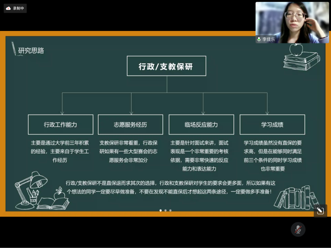成功行政保研的李佳乐则强调了前期准备的重要性,她认为只有做好充分的准备才能在考场上和面试中临危不惧。同时,同学们在准备的基础上要与自身实际相结合,如在行政和支教保研上加强行政工作能力、增加志愿经验、提高临场发挥能力和学习成绩。