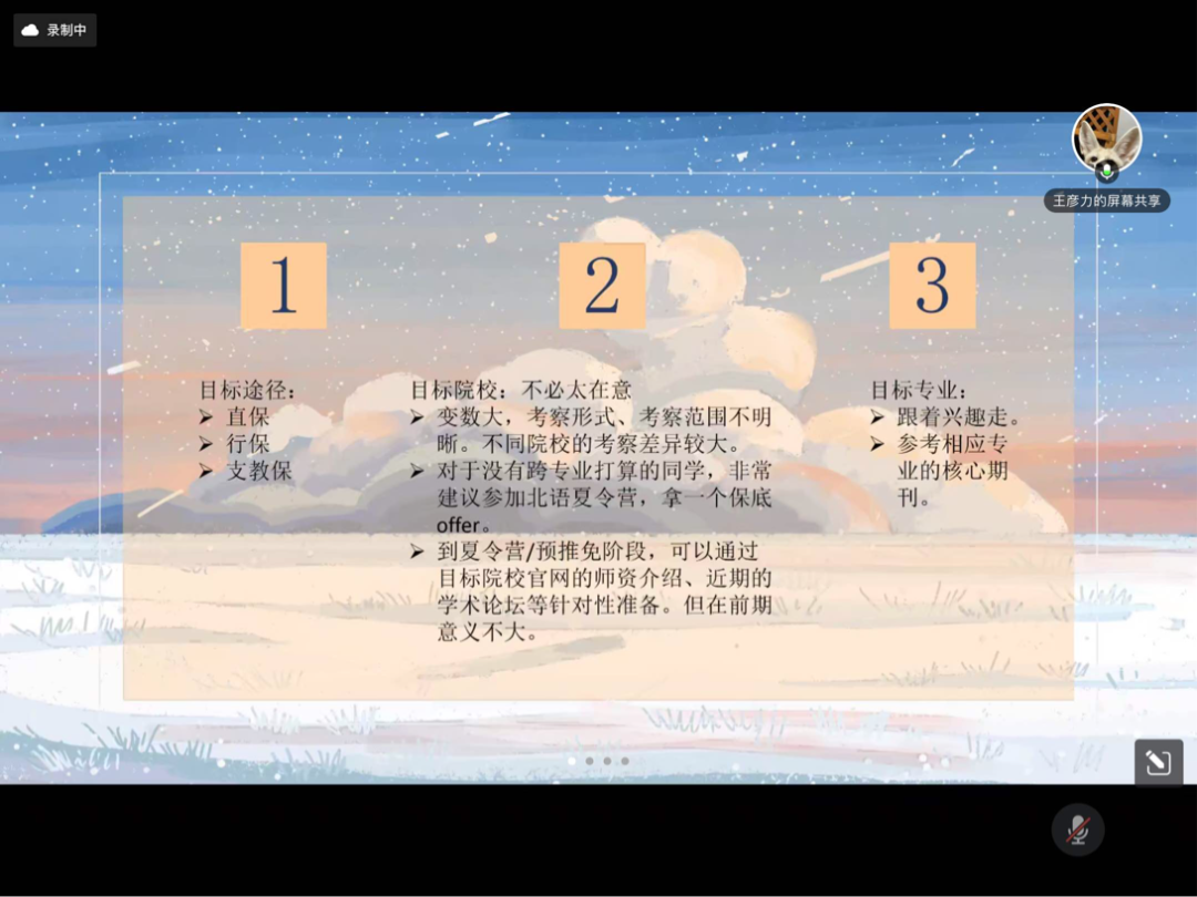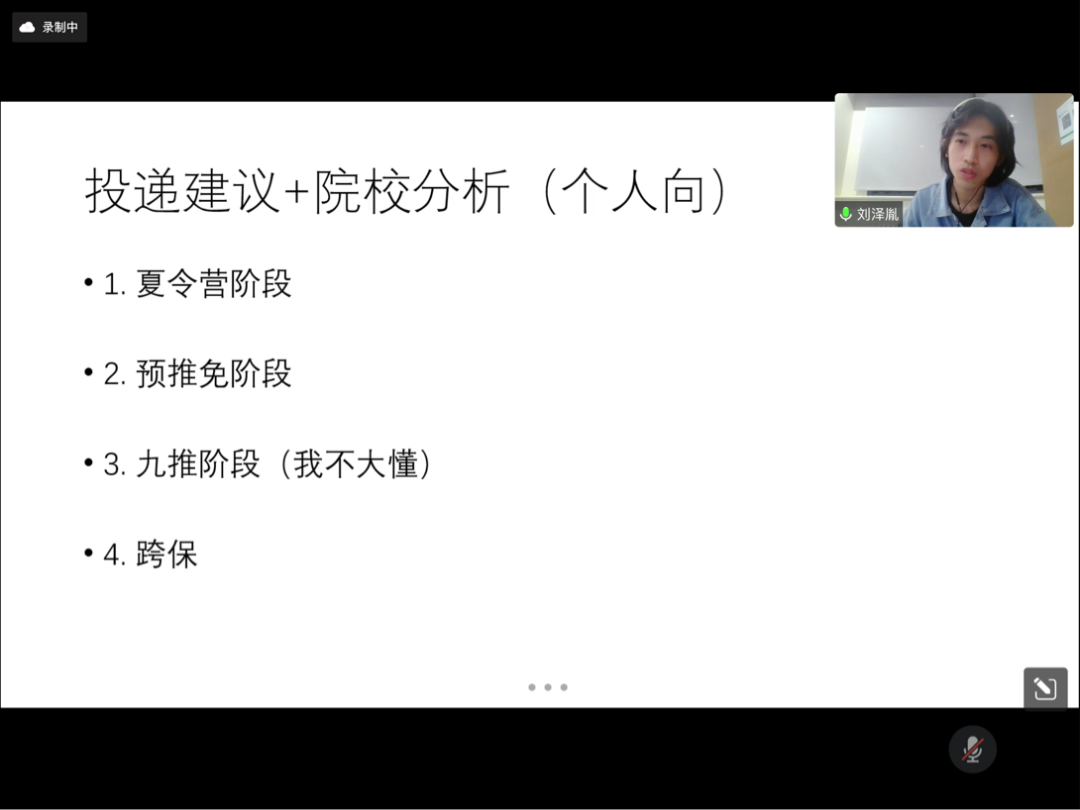 接下来是保研至北京师范大学中国民间文学的刘泽胤则从投档建议和院校分析切入,告诉同学们要对出国和保研、直博和硕士进行充分考虑,并维持好保研时期的心态,同时强调了平时积累的重要性。除此之外,他分享了他的一些个人经验与心得体会。