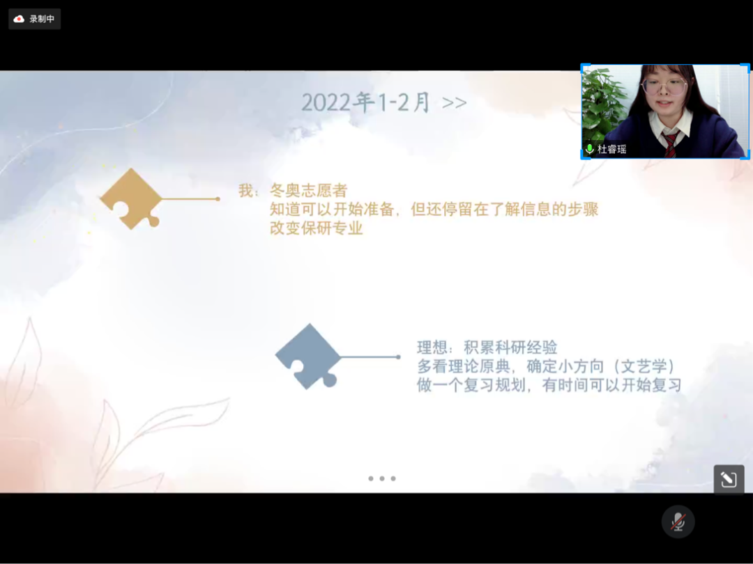 交流会分为三个板块,第一板块为专业保研板块,由四位学长学姐进行讲解。保研至北语比较文学专业的王玥潼同学从个人情况、确立目标、时间线、面试四个方面分享自己的保研经验。王玥潼告诉同学们要善于思考,详细地说明了保研的步骤、准备内容与时间等有效方法并且分享自己参加高校面试的经验和教训。