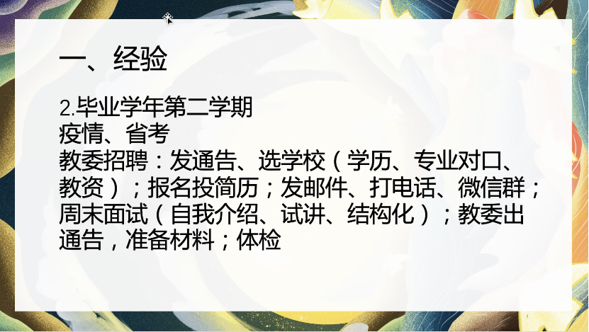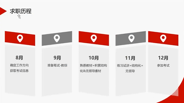 学姐总体的分享分为两个部分。第一部分中学姐分享到,要做好求职前期的准备工作。主要是想好从事什么工作、工作的城市以及为什么想要从事这一工作。第二部分中学姐主要介绍如何去准备和进行教师招聘考试。首先要收集招聘信息,明确考试方式,慎重选岗。9月进行笔试的准备,主要通过学习教材、刷网课、做练习。10月进行试讲的准备,主要是明确试讲流程,熟悉教材,分体裁练习试讲,准备过程中也可以充分利用线上资源。11月的时候准备结构化提问,主要积累素材,分题型建立框架,准备妥当后要不断练习。12月和1月的时候进行考试,要考虑时间冲突、疫情影响以及现实因素,最为重要的同样是要心态平和,自信面对考试。
