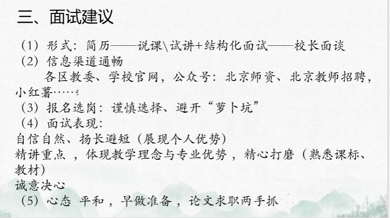 学姐从求职经历和面试建议两个方面进行分享。首先,学姐讲述自己的求职经历,在经过一次次面试后发现更适合自己的是高中语文。所以要在经验积累中找寻到自己的兴趣点和能够凸显个人优势的就业方向。其次,学姐为大家分享了一些面试相关的经验。从各渠道进行收集信息,保持信息通畅。报名岗位的时候要谨慎选择、避开萝卜岗。面试过程中要尽可能展现个人优势,试讲要精讲重点体现自己的专业优势,要精心打磨试讲内容。同时,在求职过程中要保持心态平和,论文和求职要同步进行。