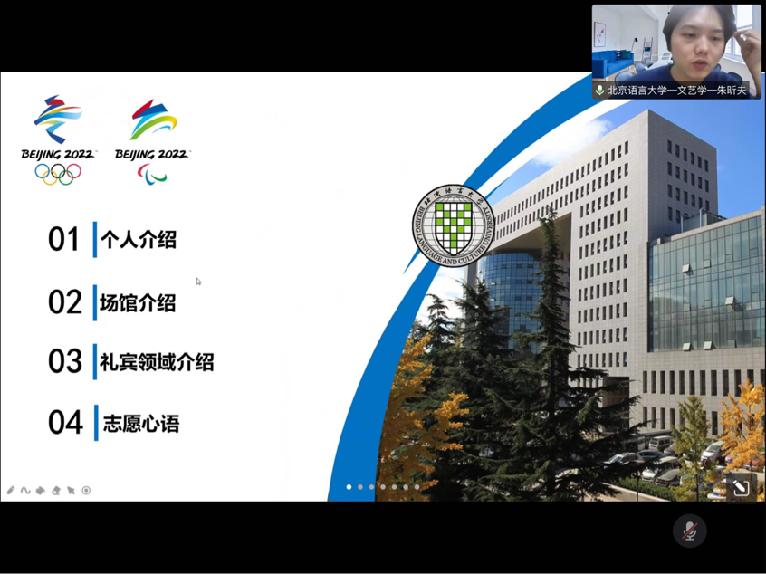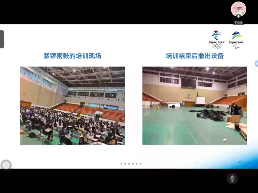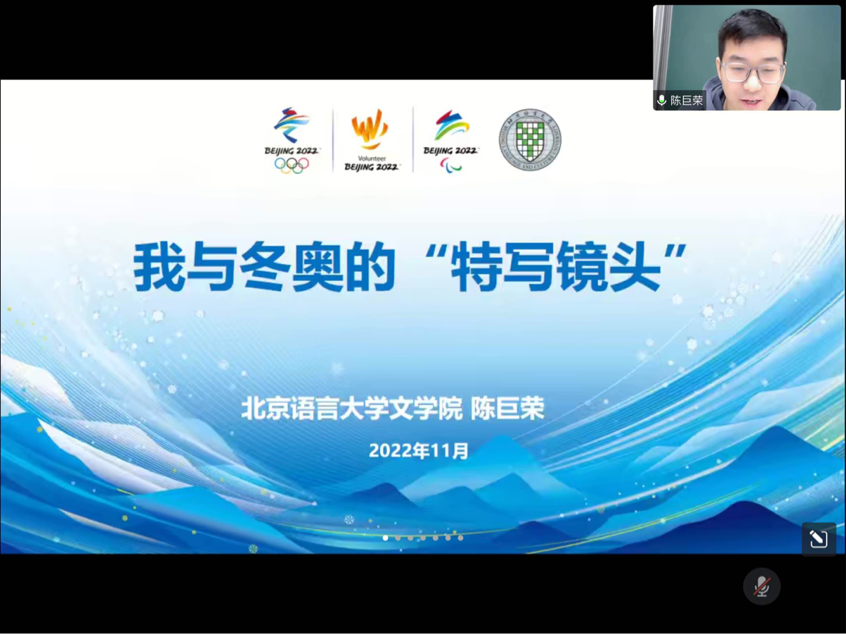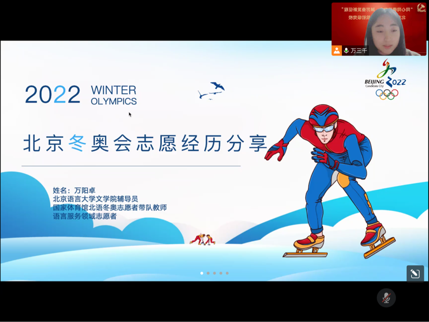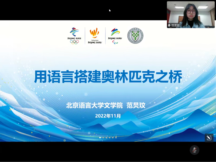 之后,三名学生志愿者依次分享。2021级比较文学与世界文学专业研究生范炅玟分享主题为“用语言搭建奥林匹克之桥”,提到进入冬奥闭环之前不断打磨自身口译水平,冬奥服务期间积极承担领域任务,努力发挥角色价值,并与同岗位志愿者合理分工,协同保障。