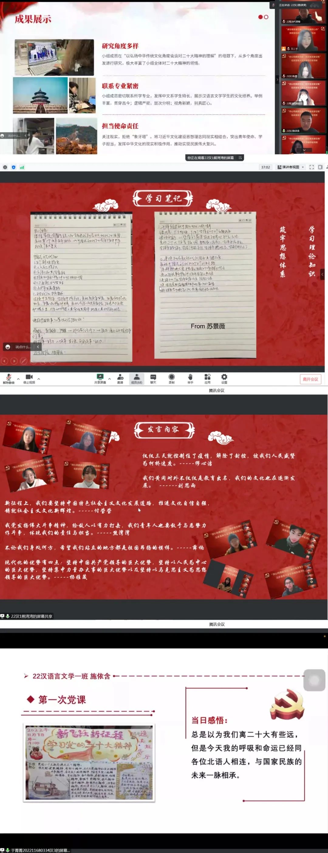 本科生辅导员万阳卓对首期初级党校的情况进行了总结,路承昊、康雅博、熊湾湾、于菁菁、李天艺等5位学员代表所在小组进行了发言,分别从“弘扬中华优秀传统文化”“人民江山”“中国式现代化”“青年人的使命”“教育科技人才”五个角度汇报了学习情况及对二十大精神的理解。