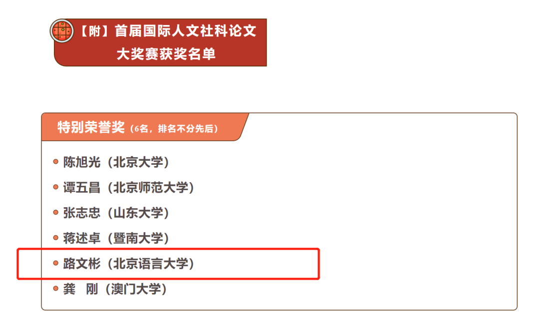 近日,由中澳合办《中文学刊》杂志社主办的“首届国际人文社科论文大奖赛”落幕。在《中文学刊》官方公布的获奖名单中,北语师生成绩斐然。文学院路文彬教授获特别荣誉奖,文学院韩文易、赵月同学获优秀奖,李花、胡佳敏同学获佳作奖。