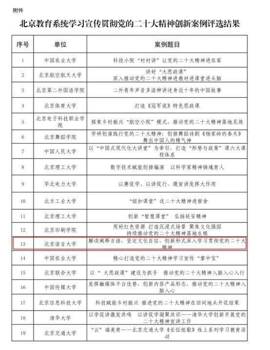 近日,北京市委教育工作委员会发布了北京教育系统学习宣传贯彻党的二十大精神创新案例名单。我校申报的《解读阐释古语,坚定文化自信,创新形式深入学习贯彻党的二十大精神》创新案例成功入选。北京教育系统共有50个创新案例入选。