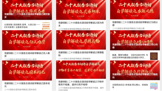 我校文学院党委结合专业特色,创新学习模式,开展古语词自学解读系列活动,组织汉语言文字学、中国古典文献学、中国古代文学、中国史等专业的研究生党员和相关教工支部对党的二十大报告中出现的古语词,进行解读阐释,学研结合,让党的二十大精神入脑入心。
