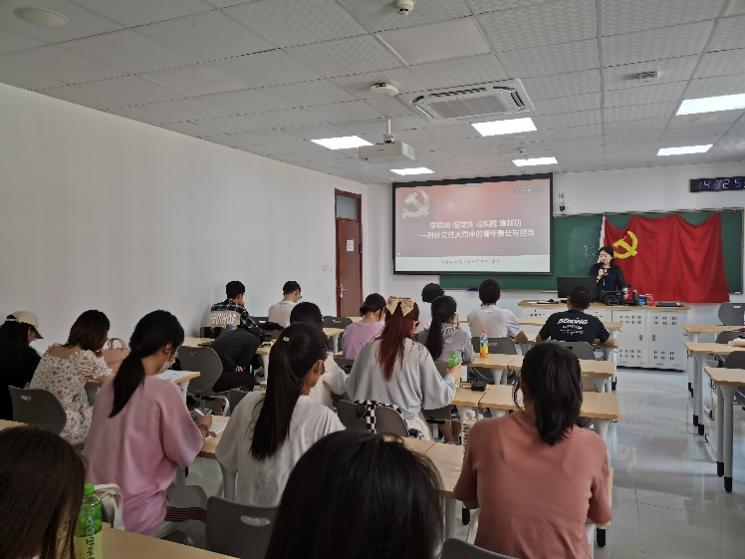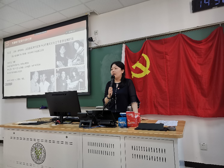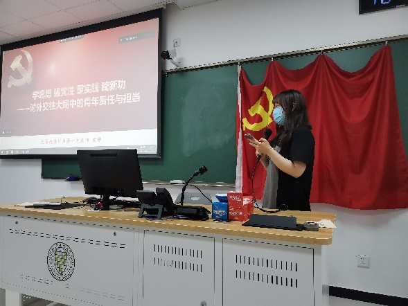 党支部书记玄铮老师以活动主题为题进行了专题党课讲解。玄老师向同学们介绍了习近平总书记关于青年工作的重要论述,强调了青年对于我们党的战略性意义,并带领同学们梳理了中国共产党领导下的青年对外工作的发展历程,以及在中国对外交往大局中北语使命。她向同学们讲解了我国提出的人类命运共同体理念所蕴含的中华传统文化内涵,即“和而不同”的理念,“家国天下”的情怀以及“和为贵”的思想影响,玄铮强调从文化典籍中可以更好地帮助大家理解我国的对外交往理念。在向同学们展示了对外交往中的青年力量后,玄老师提出青年学子应当在学习习近平总书记的论述中明确自己的责任与担当,并据此提出了三点努力方向。