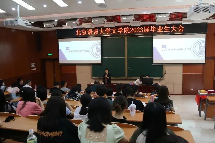 2023年6月27日,北京语言大学文学院2023届毕业生大会于主南楼102教室举行。文学院党委书记张阳、院长钱婉约、副处级组织员林建萍老师出席,教师代表陈戎女、成敏、梁慧婧、刘宗迪、席加兵、游帅、苏展、辅导员玄铮、李晗及2023届全体本硕博毕业生参与本次大会。