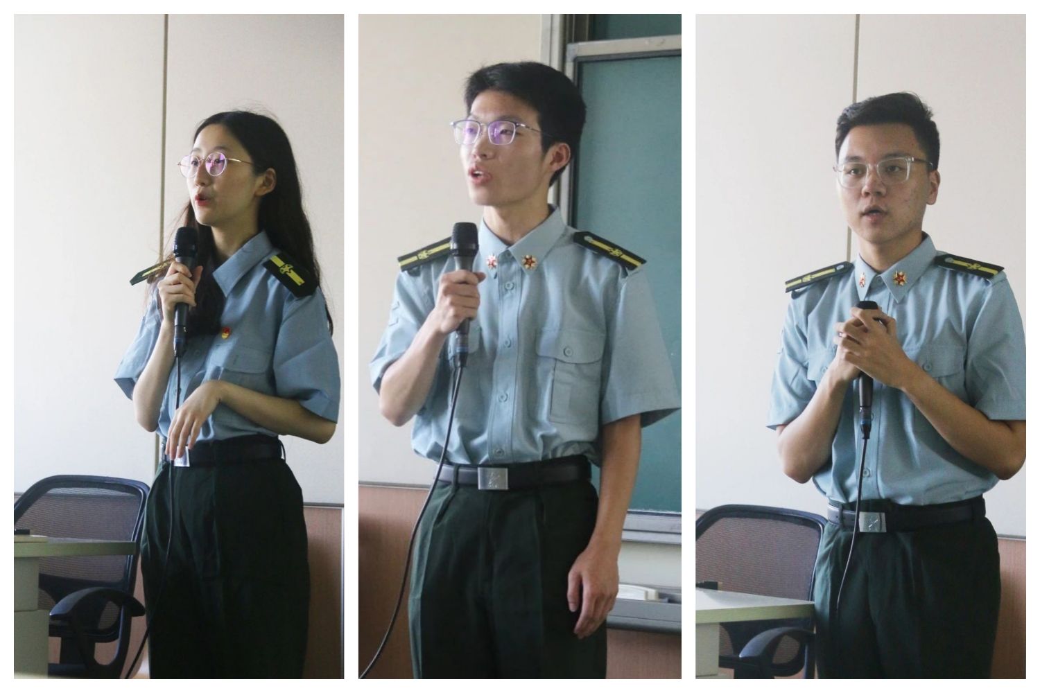 连队指导员进行自我介绍,并对同学们给予鼓励,希望同学们能够以饱满热情参与军训,做到一切行动听从指挥。同时也要自行判断身体状况,在保证身体健康的同时,认真完成训练科目。