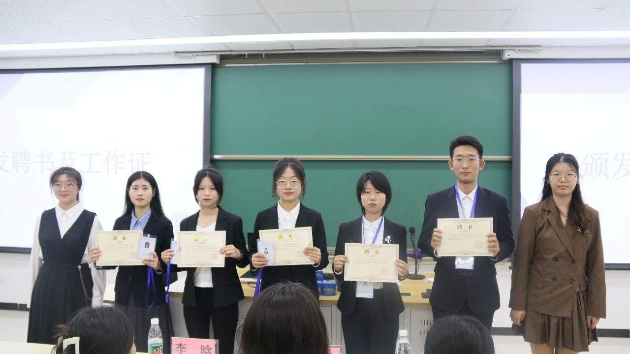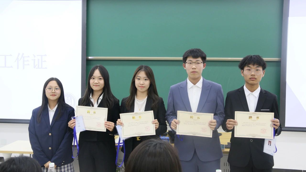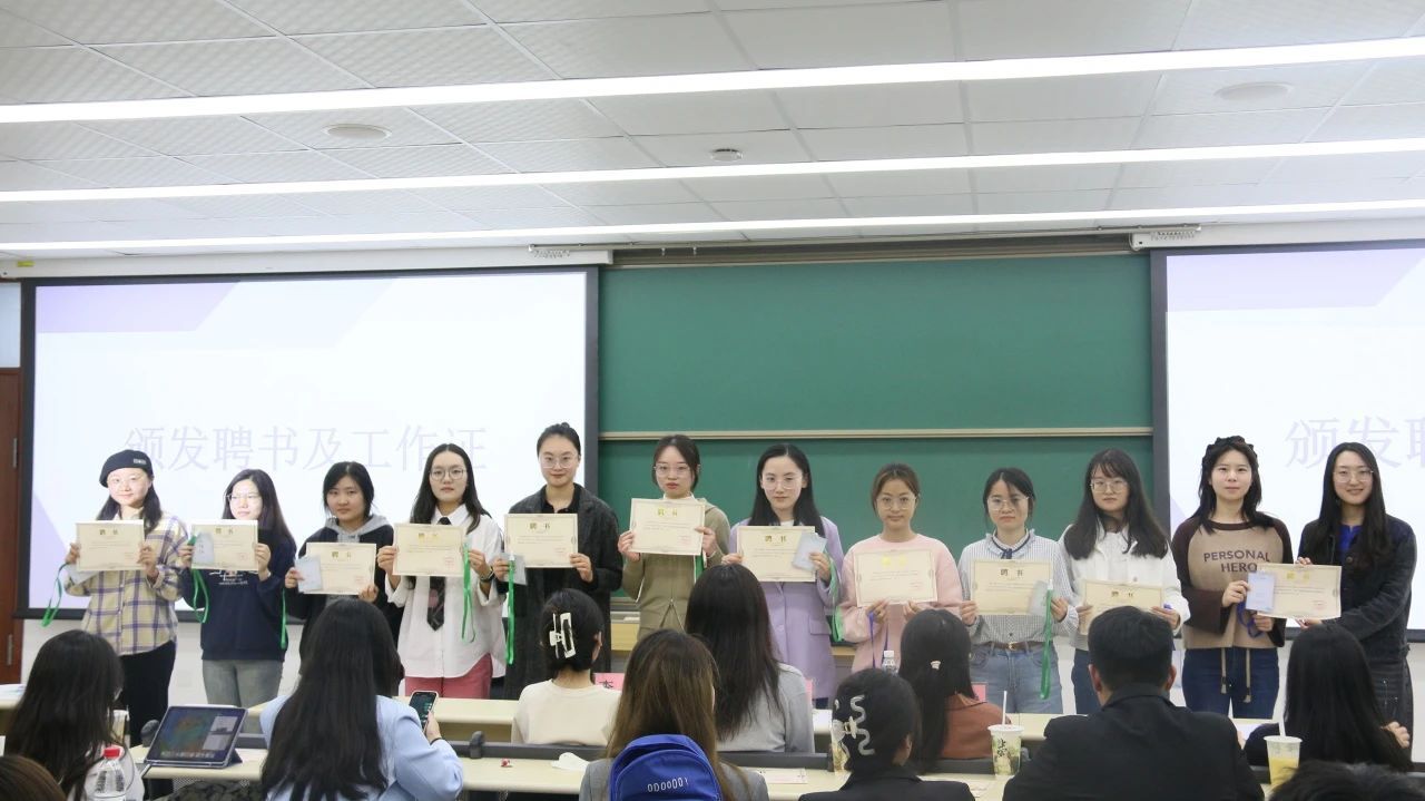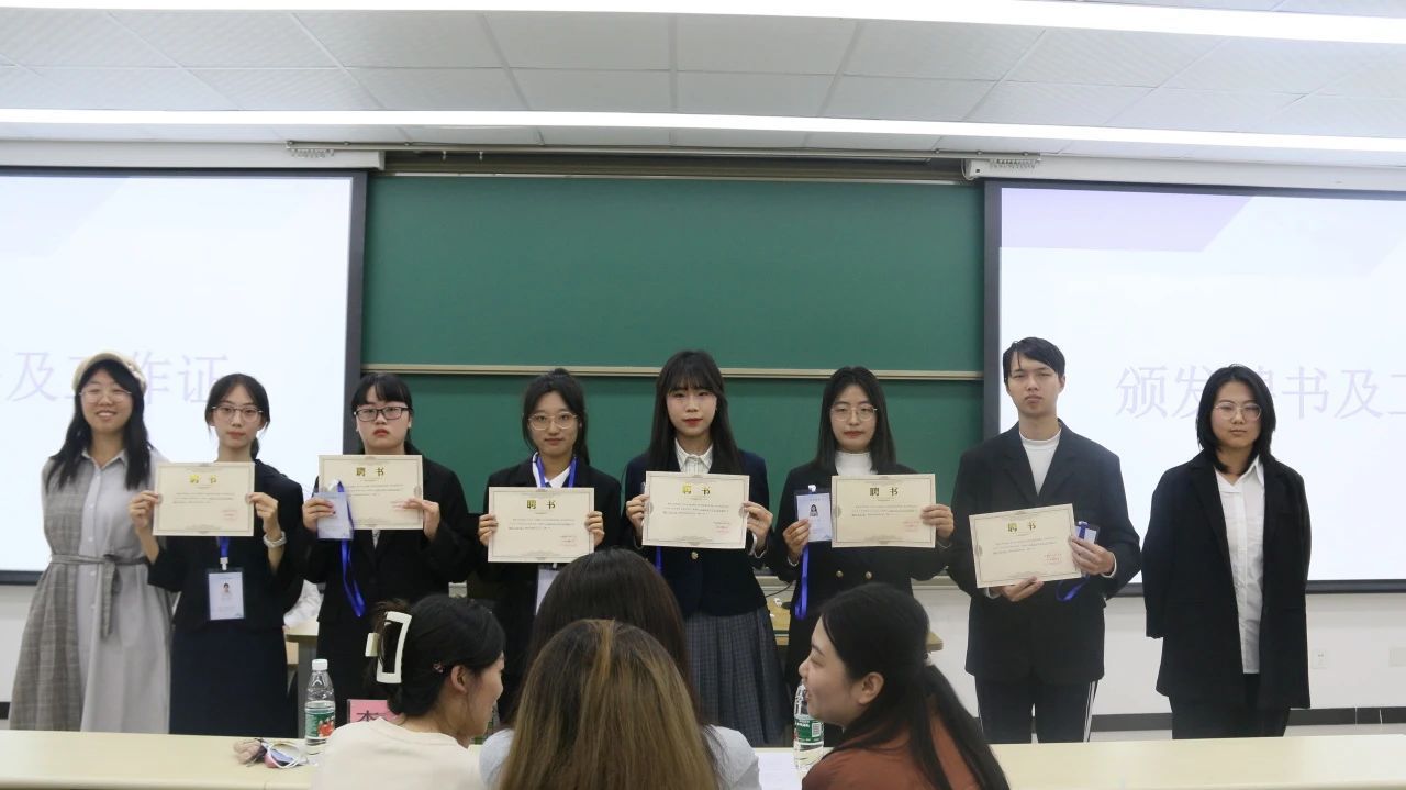 文学院团委、学生会、研究生会各部门部长、干事依次上台进行了部门及自我介绍,并颁领了聘书与工作证。部长们分别介绍了各部门的职能并表达了部门愿景,干事们饱含青春力量的自我介绍讲述了对未来工作的期待。