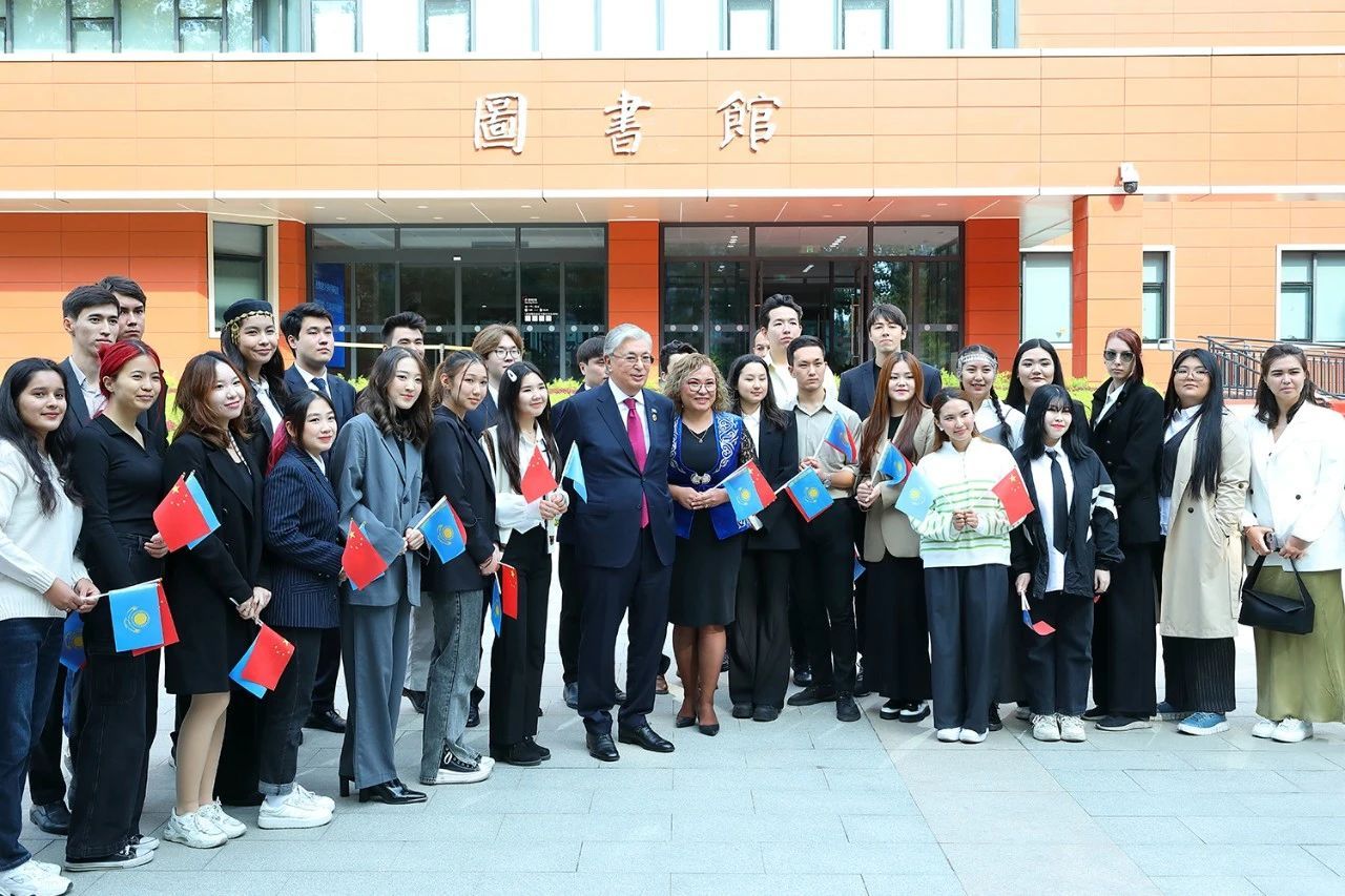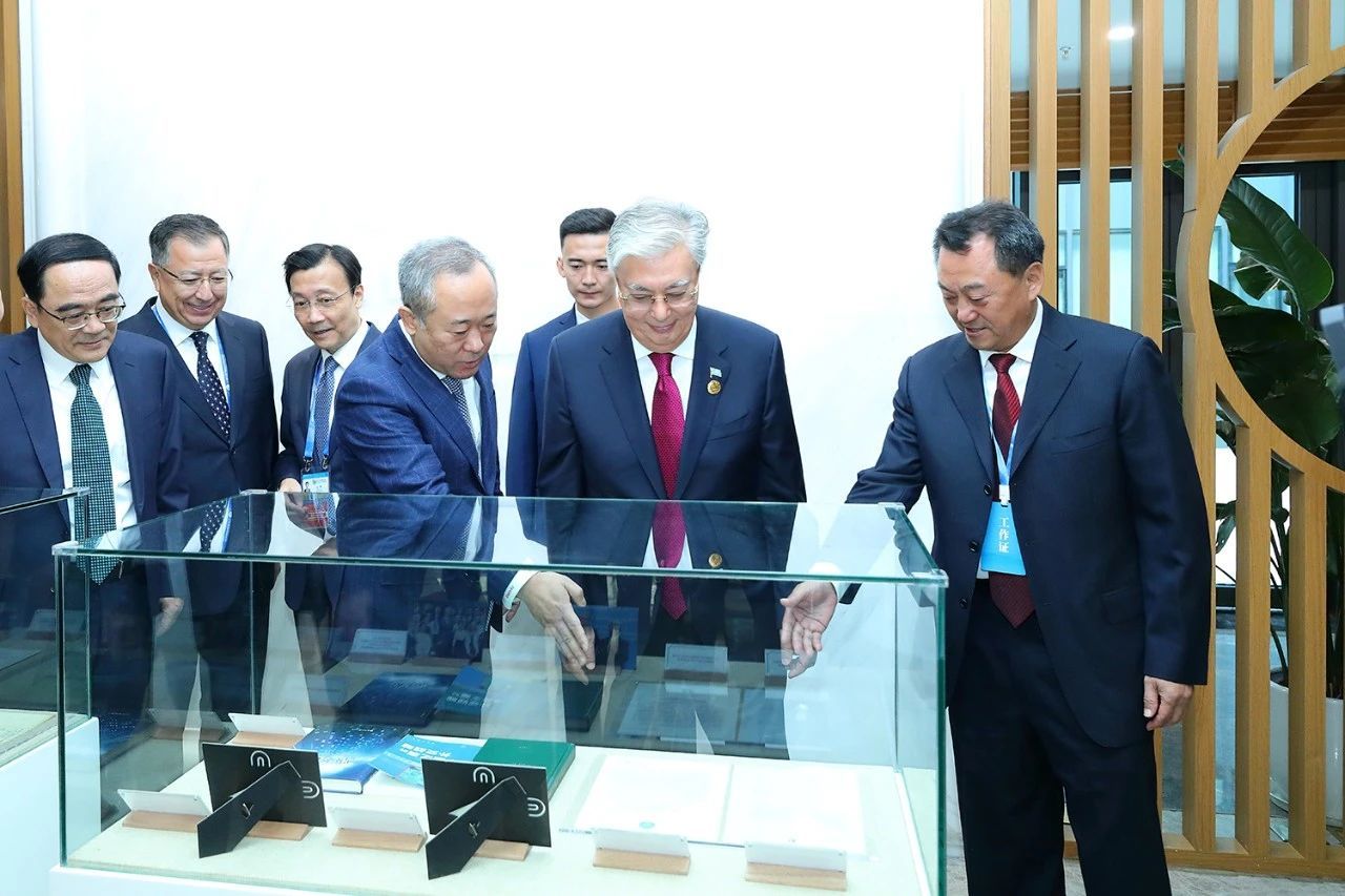 仪式结束后,托卡耶夫总统前往图书馆,与王光彦副部长、倪海东书记、段鹏校长、张霄大使等一同座谈,并与恩师刘士勤畅叙母校情谊。托卡耶夫总统还观看了其当年求学时期的珍贵资料并挥毫为母校题字留念。