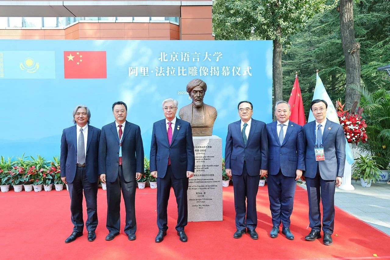 10月17日上午,哈萨克斯坦共和国总统卡瑟姆-若马尔特·托卡耶夫率团访问北京语言大学,并代表哈萨克斯坦共和国向我校赠送哈萨克草原思想家阿里·法拉比雕像。哈萨克斯坦副总理兼外交部长穆拉特·努尔特列吾、哈萨克斯坦总统国际事务助理叶尔詹•卡兹汗、哈萨克斯坦驻华大使沙赫拉特·努雷舍夫等哈萨克斯坦高级官员、阿里·法拉比哈萨克国立大学校长詹森特·图伊梅巴耶夫等哈方领导出席揭幕仪式。中国教育部副部长王光彦、中国美术馆馆长吴为山、中国驻哈萨克斯坦大使张霄、中国教育部国际司二级巡视员席茹、中国教育部国际司二级巡视员张晓东、北京语言大学校领导及中外师生代表出席了揭幕仪式。