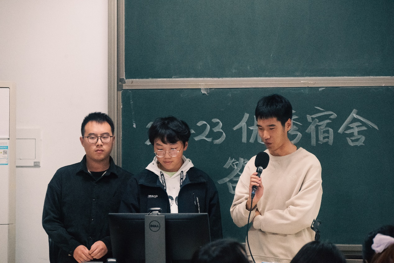 主持人首先对此次活动的具体流程进行了说明。本次活动由答辩展示与党史、团史、校史答题两个环节组成,在了解学生们宿舍建设与生活管理情况的同时,也对学生们的思想理论学习情况进行了考察。